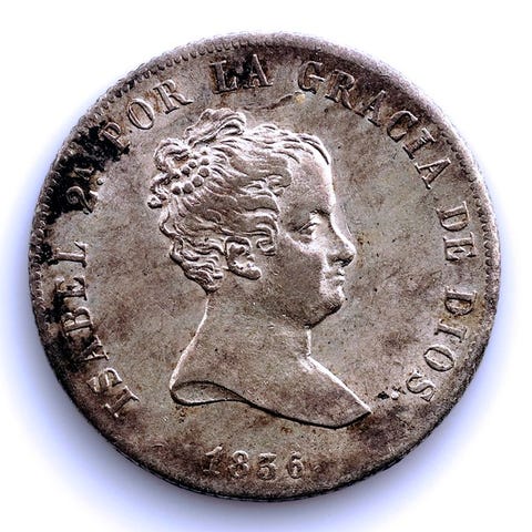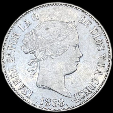 En Isabel II-mønt fra 1865, præget i Madrid, vægt 12,92 g.