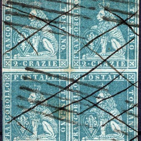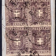 Parma, Italienske gamle stater, 1853, brugt, Stemma 5c gul-orange par annulleret med den røde gitter, Sassone nr. 6. Klik på den blå "gå til varen" knap, for at købe eller byde på denne vare. Den samlede pris vil blive vist inden du afgiver dit bud.