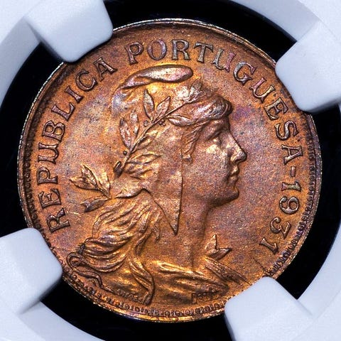 50 centavos-mønt fra São Tomé og Príncipe, Republikken, 1948, bedømt som MS67 af NGC som Top Graded og Meget Sjælden, vægt 4,50 g, diameter 22,80 mm, certifikat 4785357-046, alpaca. Klik på den blå "gå til varen" knap, for at købe eller byde på denne vare. Den samlede pris vil blive vist inden du afgiver dit bud.