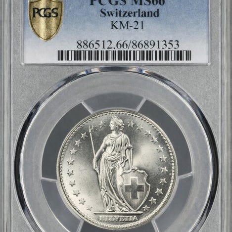 Sølvmønt præget i Bern af Den Sveitsiske Forbundsrepublik. På forsiden er Helvetia afbildet stående med lanse og skjold, et allegorisk symbol for den schweiziske nation, omgivet af en krans af stjerner, der repræsenterer kantonerne. Bagsiden viser pålydende værdi, dato og møntmærke inden for en plantekrone. En almindelig cirkulationsgenstand, men med høj