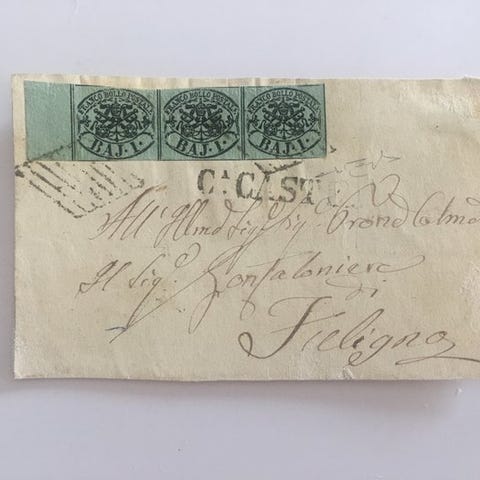 Betagende brev fra Viterbo til Canepina med to lodrette par Sassone 1Aa og et lodret par Sassone 3Ab, certificeret af M. Manzoni. Katalogværdi: Euro 6000++ (Sassone 2024). Registreret forsendelse.
