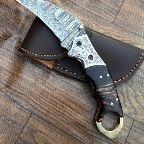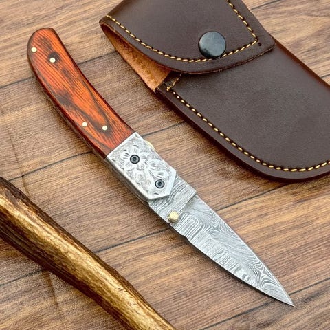 Dette kniv har et slankt, skarpt blad med en let bue. Håndtaget er lavet af mørkt træ, hvilket giver et ergonomisk greb, mens messingbeslaget tilføjer et strejf af elegance og holdbarhed. Bladets finish har et fint, lidt slidt udseende, hvilket indikerer en veludført, holdbar stålkonstruktion.