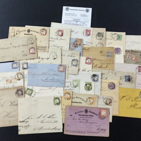 Fra Deutsches Reich, en samling af 36 breve fra perioden 1905–1919 i brugt stand, katalog 83/106, titel 36 Briefe, herunder enkeltfrankerede breve og verificerede eksempler 105a (KW 500€) og 106c (KW 900€), luftpostmærker fra 1912 og forskellige Bevisarter; ingen dubletter, billederne viser nøjagtigt indhold og tilstand. Klik på den blå "gå til varen" knap, for at købe eller byde på denne vare. Den samlede pris vil blive vist inden du afgiver dit bud.