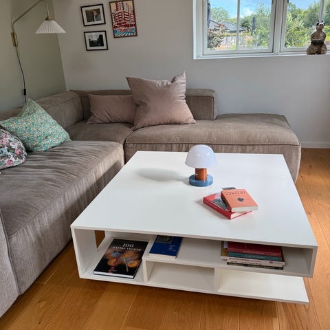 Fint sofa-/opbevaringsbord fra Innovation Living på hjul. Er i fin stand, nem at køre rundt med og kun brugt til opbevaring af sengetøj. Plade i lakeret egetræsfiner, som kan drejes ud.