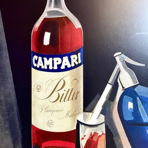 Den berømte designer Marcello Nizzoli skaber en elegant og funktionel komposition med Bitter Campari-flasken placeret ved siden af sifonen og glasset, symboler på den italienske aperitif. Den mørke baggrund fremhæver de livlige røde og blå farver, hvilket gør billedet let genkendeligt og stærkt visuelt i sin effekt.