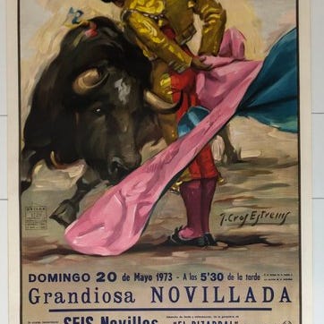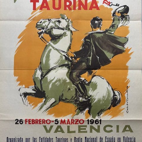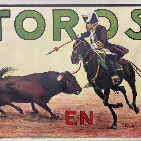 Plakat Corrida; rustpletter, rifter og flænger i hjørnerne, spor af klæbebånd (se foto);