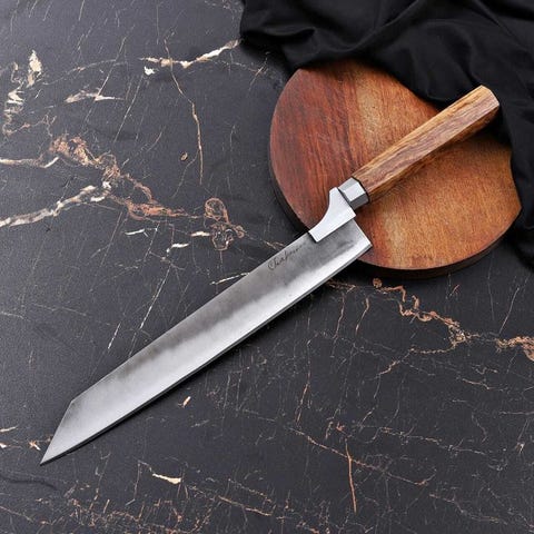 Den overordnede form er en standard kokkeknivprofil med en let buet blad for at lette rocke bevægelser under skæring.