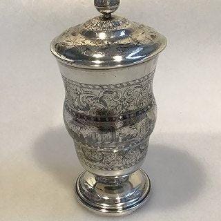 En fin, cylinderværmet sølvpennestander udstyret med rigt udarbejdede niello-dekorationer, fremstillet i Indien i det 19. århundrede.