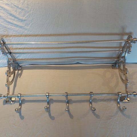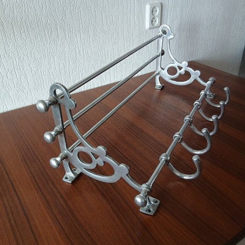 Aluminium hat-, jakke- og frakkestativ af designeren János Diósy, Ungarn, i god stand med mindre tegn på aldring, Art Deco-stil, cirka 1920–1940, mål 103 cm bred, 29 cm dyb, 12 cm høj, en enhed. Klik på den blå "gå til varen" knap, for at købe eller byde på denne vare. Den samlede pris vil blive vist inden du afgiver dit bud.