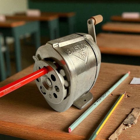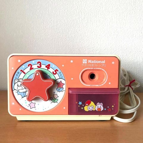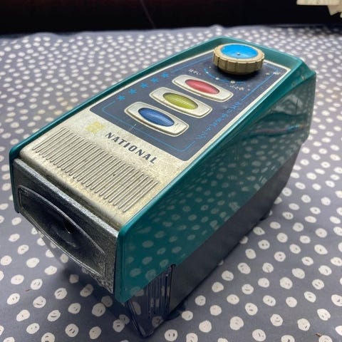 En charmerende vintage elektrisk blyantspidser 'Pendy' af National (Panasonic Electric Works), model KP-5P, lavet i Japan under Showa-æraen (ca. 1980'erne).