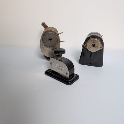 National KP-5P elektrisk blyantspidser, fremstillet i Japan, Showa-æraen (ca. 1980’erne), plast og metal, god brugt stand med mindre ældre tegn, dimensioner 10 × 7,5 × 4,5 cm, vægt 250 g. Klik på den blå "gå til varen" knap, for at købe eller byde på denne vare. Den samlede pris vil blive vist inden du afgiver dit bud.