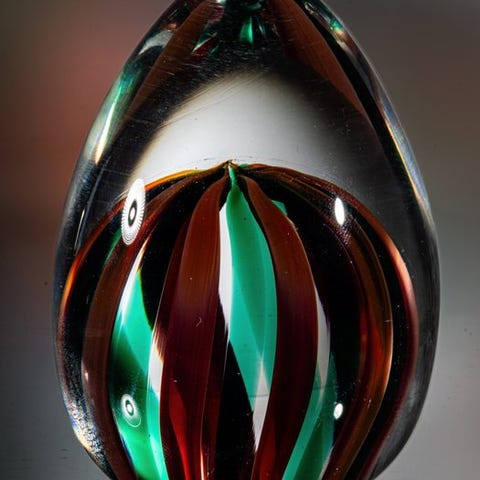 Ægformet. Fem abstrakte Millefiori-blomster rejser sig fra en krystal-lignende bund, bestående af adskillige luftperler. Blomsterne dannes af enkelte Millefiori-canés i blå, guld, rød og hvid. Smukt farvespil og flotte visuelle effekter – især under passende belysning.