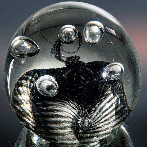 Fantastisk abstrakt glas-papirvæg, designet og håndlavet i 1989 af Udo Edelmann for CCAA Köln, signeret, unikt håndlavet objekt i kugleform, Ø 8,4 cm, højde 8,4 cm, vægt 836 g, produceret i Tyskland og dateret til 1980–2000, i fremragende stand. Klik på den blå "gå til varen" knap, for at købe eller byde på denne vare. Den samlede pris vil blive vist inden du afgiver dit bud.