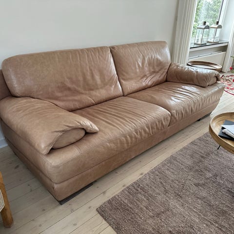 Sofaen blev leveret til vores nuværende bolig d. 1. oktober i år. Siden levering har den været dækket af tæpper for at beskytte læderet 100%. Den står i et røgfrit hjem.