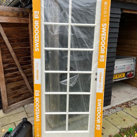 Det medfølger karme samt gerigter. Døren har været monteret med gennemgående gulv, så der er ikke noget bundskykke. Dørhåndtag medfølger ikke.