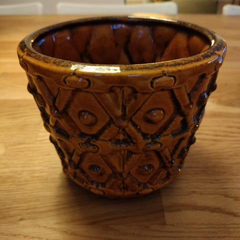 Glaseret keramik skål/urtepotte i rødbrun farve med grønne nuancer. Den er designet Marianne Starck, for Michael Andersen & Søn Bornholm, omkring 1960erne.