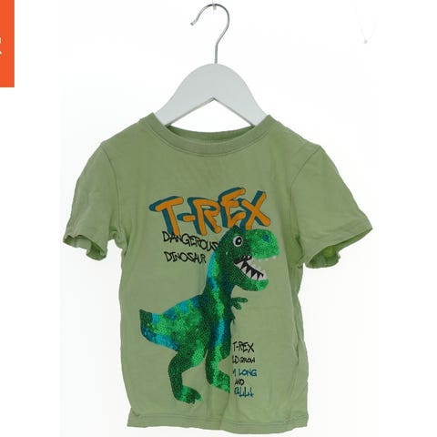 T-shirten har lange ærmer og er primært grå. På forsiden er der et stort motiv af en grøn dinosaur med åbent gab omgivet af lyn. Ordet 'DINOSAURIA' er trykt nederst på fronten. Bagsiden er ensfarvet grå.