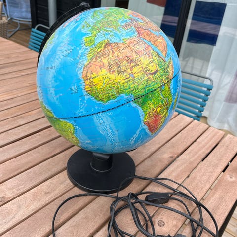 Globuslampe fra 60/70-erne. Ca 28 cm høj. Ø på globus ca 20 cm. Da det er en gammel globus, er kortet ikke up to date 😊