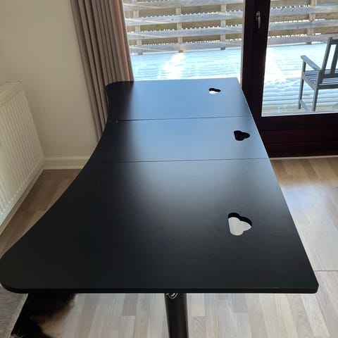 Pænt sort skrivebord. Perfekt som gamer skrivebord med huller ledninger og net under bordpladen.