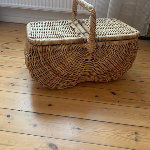 Picnickurv fremstillet i fletmateriale med bærehåndtag og låsemekanisme. Kurven har en rektangulær form med låg, som kan åbnes og lukkes, og indvendige stropper til fastgørelse af indhold. Velegnet til opbevaring og transport af mad og drikke til picnic eller lignende aktiviteter.