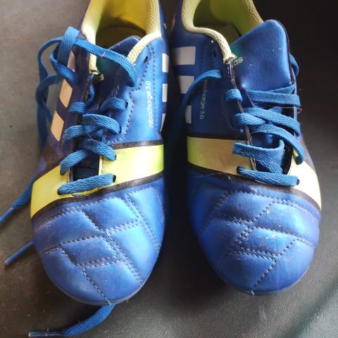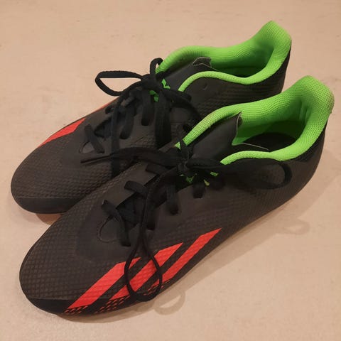 Adidas F5 fodboldstøvler i sort med røde detaljer og grøn inderside i størrelse 37 1/3. Støvlerne har en gummisål med knopper egnet til spil på græsbaner. Designet til at give greb og støtte under fodboldspil.