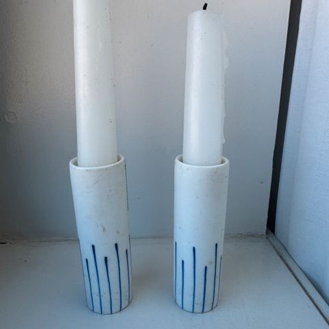 lysestager i sæt af 2, lavet af hvid keramik. Hver lysestage har en højde på ca. 20 cm og en bunddiameter på ca. 15 cm. Produktet er velegnet til brug som dekorative lysestager i hjemmet.