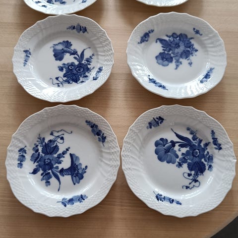 Royal Copenhagen / Blå Blomst. Samling best. af: 7 stk. Frokosttallerkner flettet nr. 8096, 2 dybe tallerkner 854, 1 frokost kantet nr. 8550, i sidetallerken flettet nr. 8095. Alle tallerkner med afslag og chips. Sælges kun samlet. Og sendes ikke.