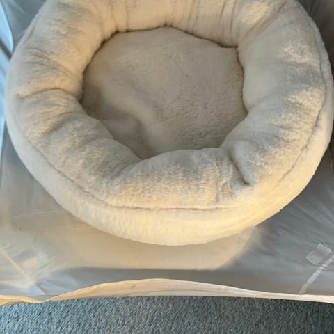 Rund hundeseng med yderside i brun og creme farvet stof og blød, cremefarvet inderside. Velegnet til kat eller små hunde