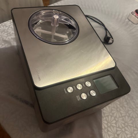 Sandstrøm S15ICE14E ismaskine med digitalt display og betjeningsknapper til tid og menuindstillinger. Enheden har en sort overflade og er designet til fremstilling af is.
