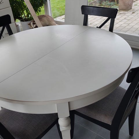 Med en diameter på 130 cm er der plads til 4 personer, men når gæsterne melder deres ankomst, kan bordet nemt udvides til at rumme 6-8 personer ved hjælp af tillægsplader (der følger 2 med ). Det ekstra støtteben sikrer stabilitet, skal hentes fra Østerbro asap.