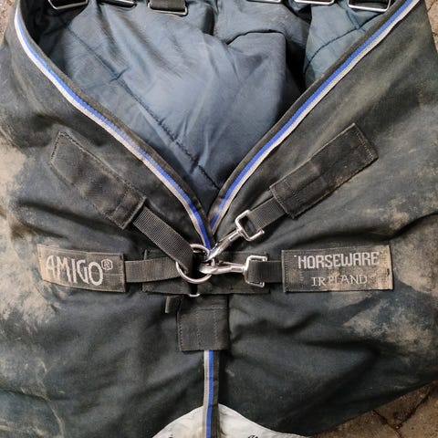 Horseware Amigo Bravo 12 Turnout dækken i størrelse Medium med en vægt på 250g. Dækkenet er lavet af materialer, der sikrer holdbarhed og beskyttelse til hesten. Mørk grå med mørklilla kantebånd.