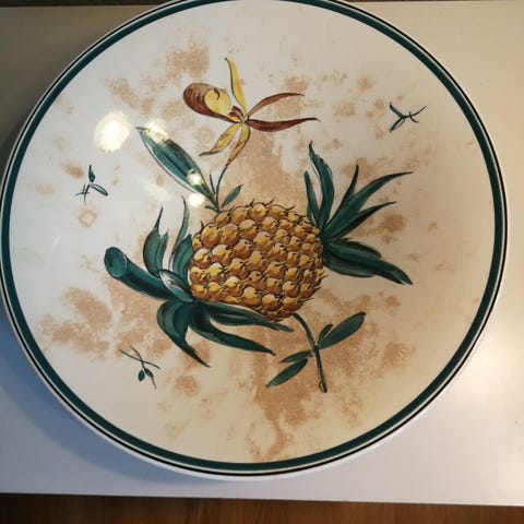 Smukt gammelt fad produceret i årerne fra 1878 - 1904. Dekoreret med smukke blomster. Fadet er i hel og fin stand med slid på guldkanterne og patina. Bredest 29 cm - højde 13 cm. Kan afhentes 8381 Tilst eller sendes + forsendelsesomkostninger.