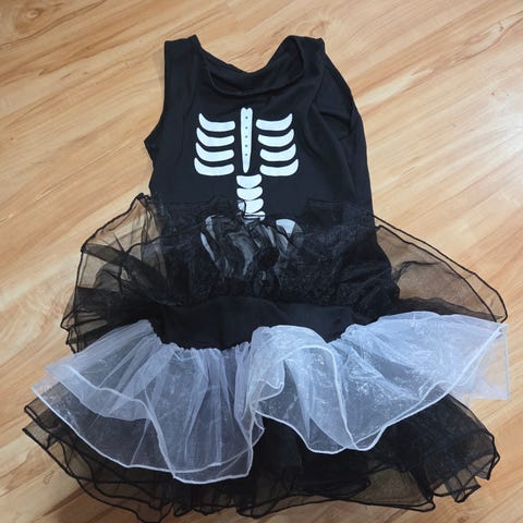 Sort kjole med skelet print foran, dekoreret med farverige, geometriske mønstre i blå, lilla og gul. Det har korte puffede ærmer og en nederdel med lange pink og blå tylstrimler. Der er også en tilhørende hårbånd med blå og pink pom pom detaljer.