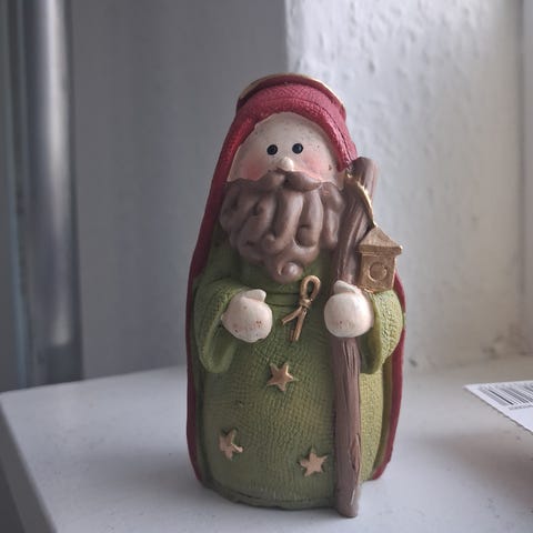 En nissefigur, som virker til at være lavet af keramik eller et lignende materiale. Figuren er ca. 8,5 cm i størrelsen og har stribede røde og grå dragter med en rød nissehue. Figuren kan bruges som en dekoration i hjemmet, især i julesæsonen.
