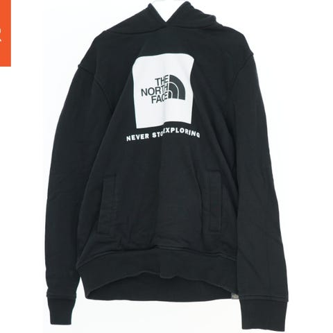 Gul hættetrøje med kængurulomme foran og et stort sort logo med teksten 'THE NORTH FACE' på forsiden. Trøjen har en hætte og lange ærmer. Bagsiden er ensfarvet gul uden dekorationer.