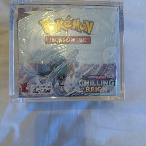 Pokémon Chilling Reign Trading Card Game Booster Box med flere pakker kort. Indeholder kort fra Chilling Reign udgaven af Pokémon TCG. Velegnet til samlere og spillere.