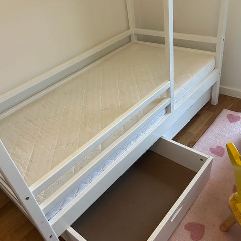 Vi sælger vores seng til hurtig afhentning, madras og topmadras medfølger. Synlige brugsspor på sengen, men rigtig fin madras og topmadras - prisen er sat herefter.