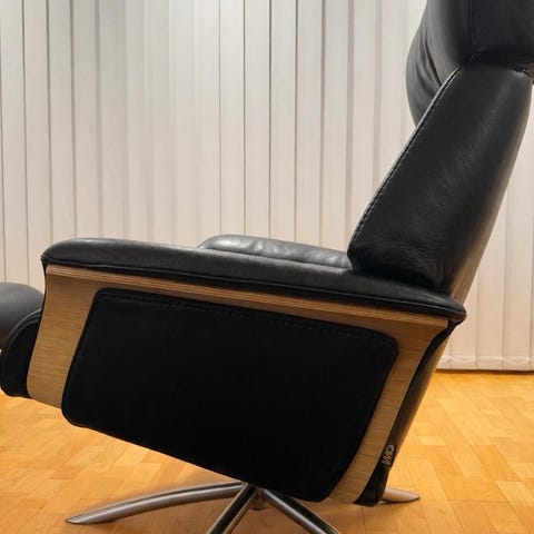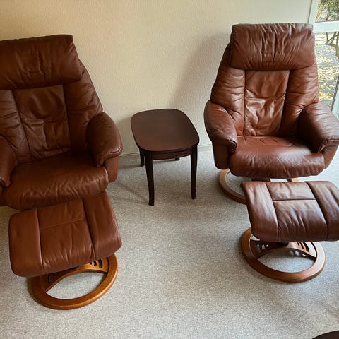2 stk. IMG Comfort Of Norway lænestole fra Ilva i ægte læder. En skammel medfølger. Står næsten som nye. Ca.5 år gamle men ikke brugt ret meget. Sæt pris: 2 stole + skammel. Nypris 25.000kr