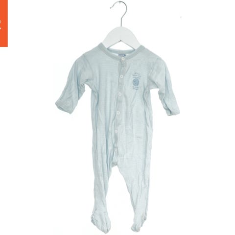 Heldragt til babyer lavet af blødt stof i en creme farve med små blomstertryk. Dragten har lange ærmer og trykknapper, der gør det nemt at åbne og lukke. Det har en kryds lukning foran og små blomster designs fordelt over hele dragten.