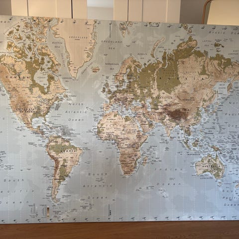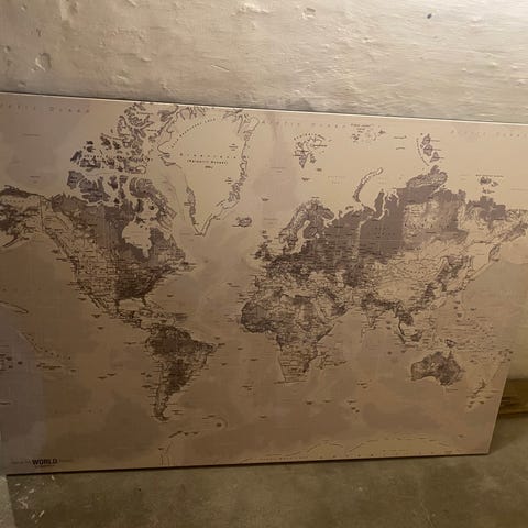 Verdenskort på 200 x 140 cm lærred, spændt ud over fire metalstænger (se øvrige fotos).