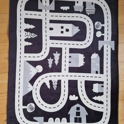 Dette børnetæppe måler 135x75 cm og er prydet med et vejtema. Designet inkluderer veje, trafikskilte, og en helikopterlandingsplads, perfekt til leg med biler og legetøjsfartøjer. Lavet af blødt og holdbart materiale, det er ideelt til at skabe en sjov og stimulerende legeplads for børn på deres værelse eller legeområde. Tæppet har en primært grøn farve med detaljer i grå, blå og andre farver.