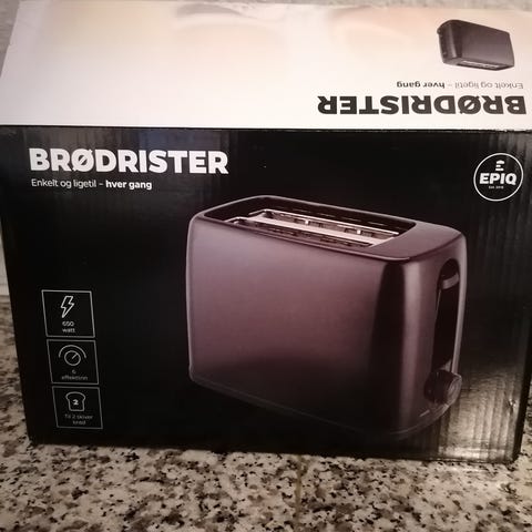 EPPTO Toaster med 750 watt effekt. Sort farve og kompakt design. Velegnet til at riste brød og andre sandwichprodukter.