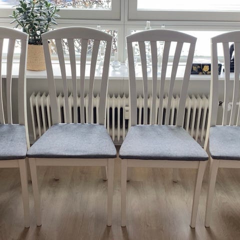 Den ene stol mangler en skrue ( intet problem for brugen ) og en af stolene har en lille plet ( se billede ) ikke forsøgt fjernet.