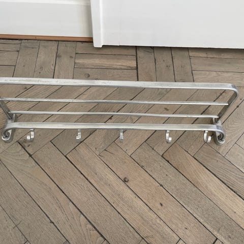 Lække krom hattehylde med sort ramme og en overhylde med grå plastsnor. En klassisk ting fra 1960'erne, men i super fin stand.