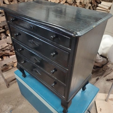 Lille kommode, slebet og malet i flot blågrå farve. Afhenteses i Solbjerg