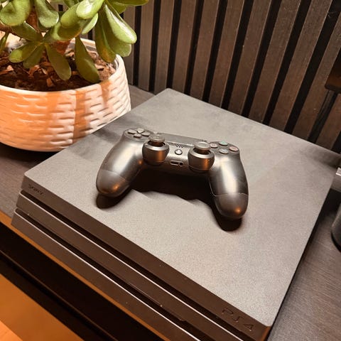 PlayStation 4 slim spilkonsol i sort farve.