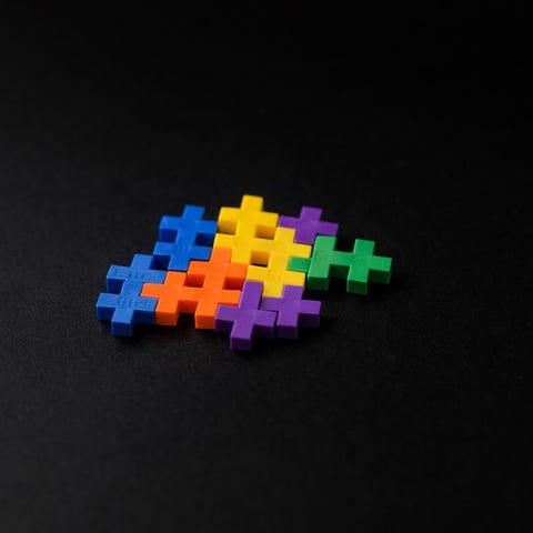 Plus-Plus Mini byggesæt med 800 stk i forskellige farver, herunder lilla, sort, pink, grøn og blå. Delene er lavet af plastik og kan bruges til kreativ leg og konstruktion.