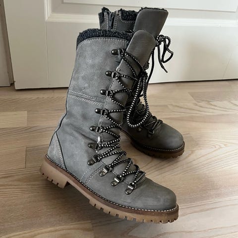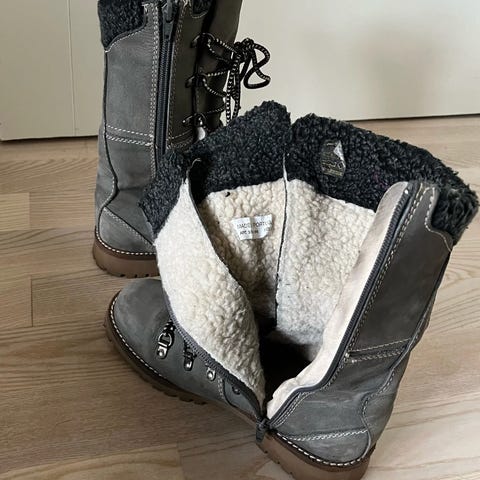 Støvlerne er brugte og har været limet foran, så de er tætte igen og klar til brug. Ellers er de pæne og har masser af gode ture i sig endnu.