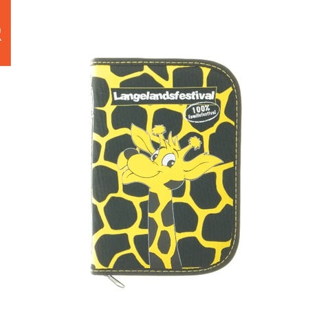 Dette er en pung med et farverigt design, der fremhæver motivet fra Langelandsfestival med en giraf. Pungen er lavet af et let, holdbart materiale og har en gul og sort farvekombination med et girafmønster. Den har en lynlås for sikker lukning og er mærket med festivalens logo. Størrelsen er 19x13x2,5 cm.
