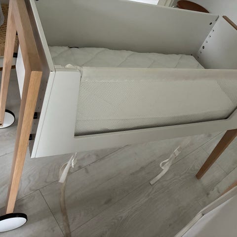 Bedside seng der sælges, da vores dreng er vokset ud af den. Sælges med sengerand, lille natlampe, madras og lagen.